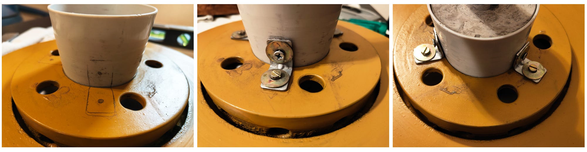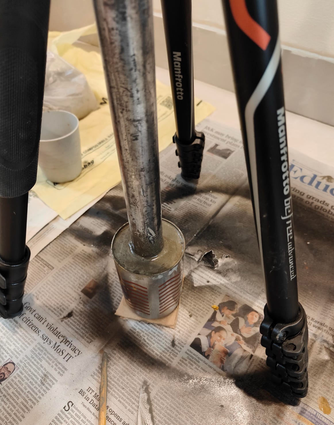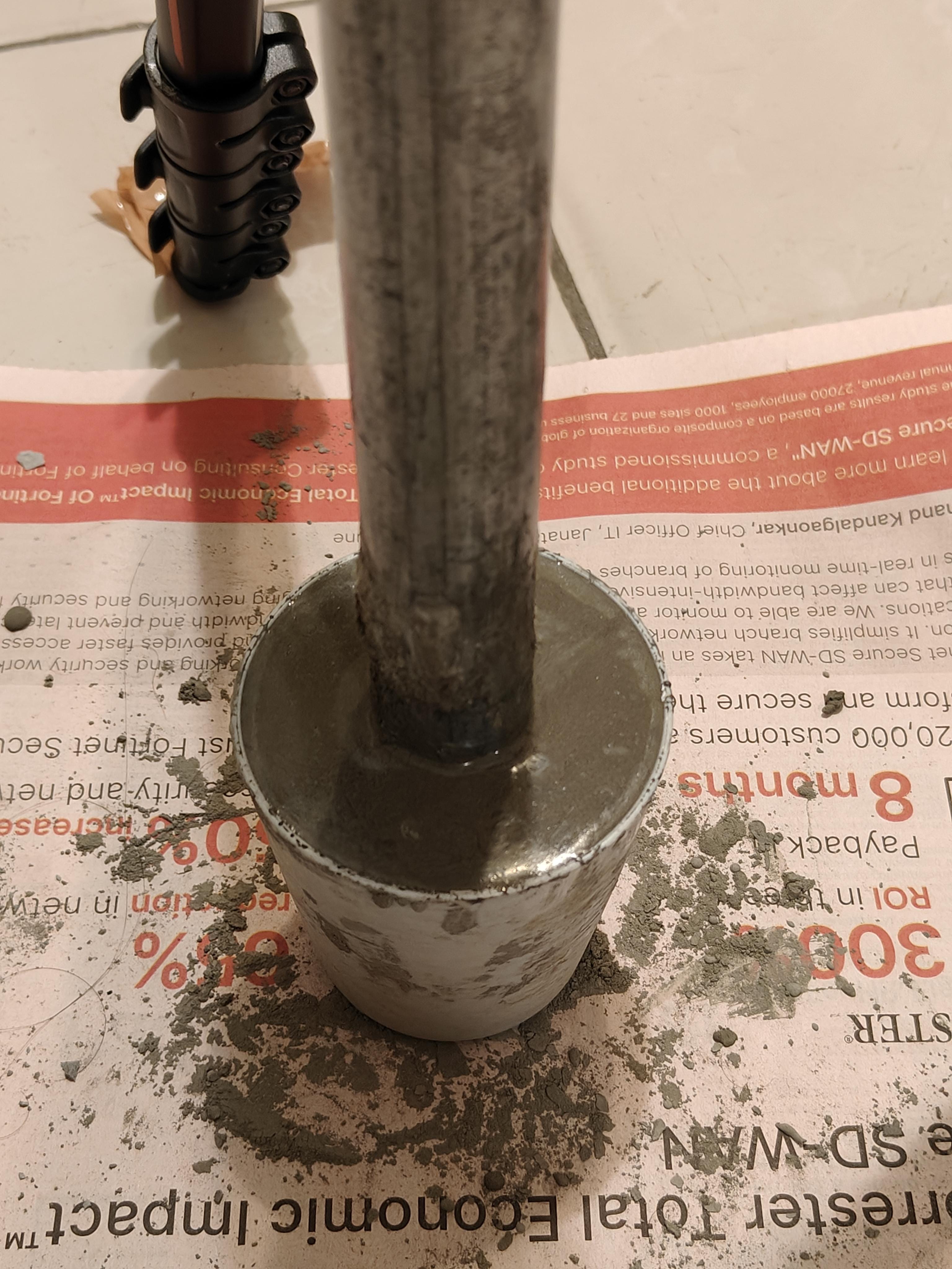 I reached out to my friends at Ather Energy—the sharpest engineering minds I knew who can sort this is in seconds. Their idea was so simple that it blew my mind. Just create a simple cement plug to hold the pipe in and screw it to the base plate using L bracket.