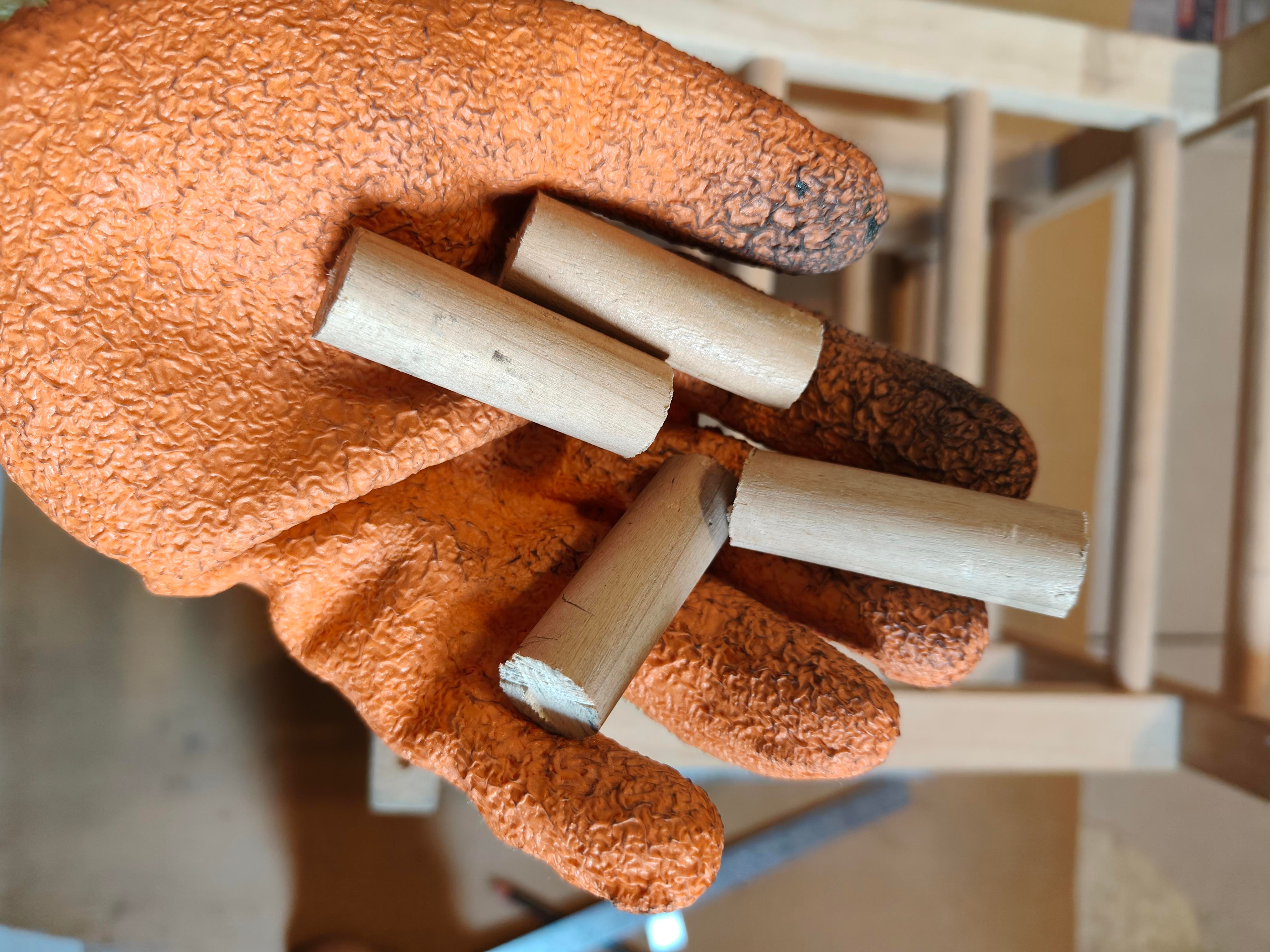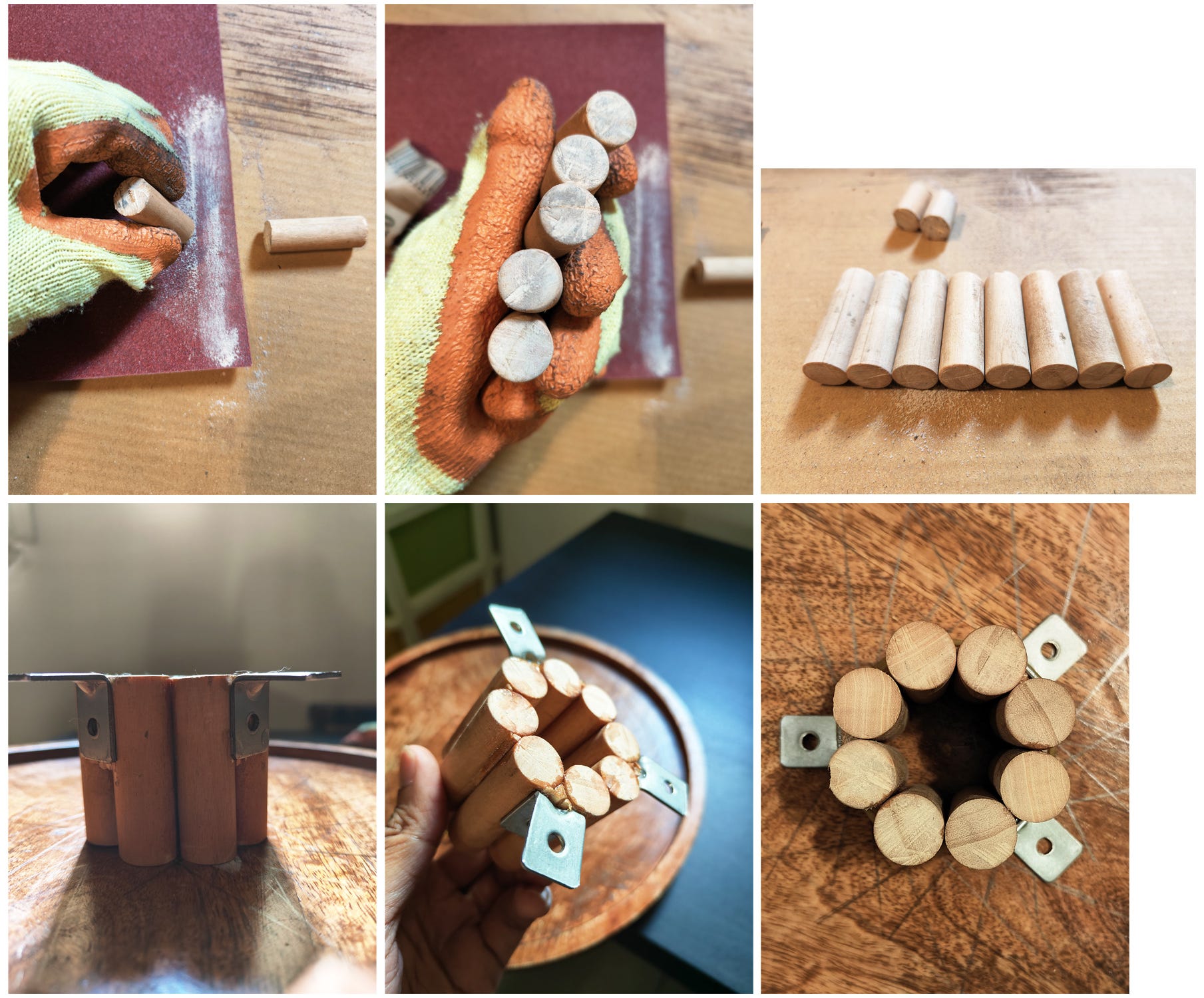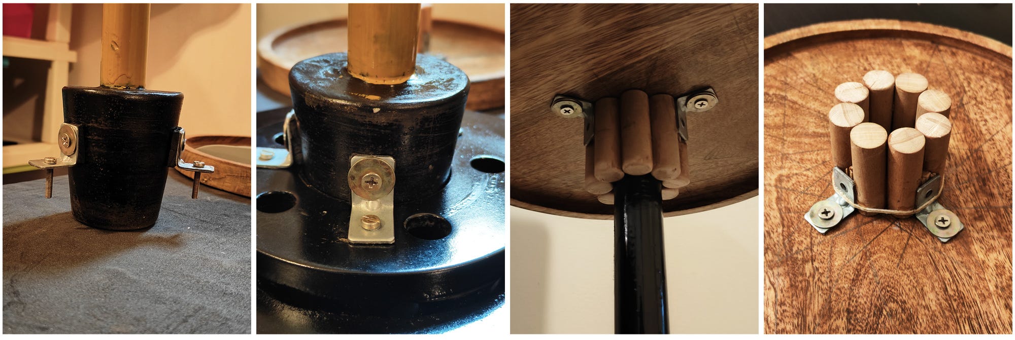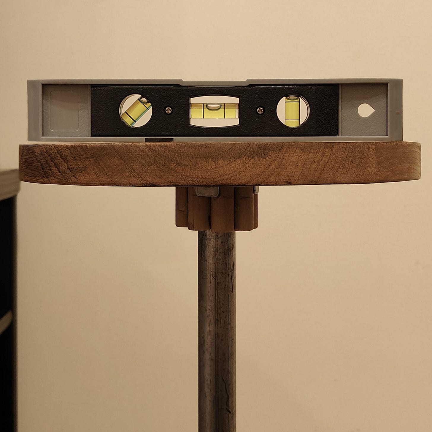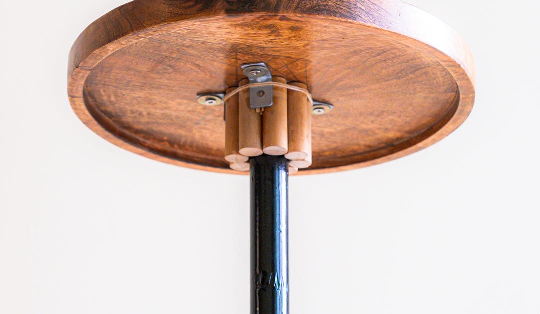 With the cement plug curing tucked away, I shifted focus to the top: the wooden tray. I didn’t want to it bolt straight to the pipe; the metal-to-wood transition would look jarring, and stability might suffer. I needed a broader transition piece— something not so obvious, functional and detailed. Scouring the house like an FBI agent, I found a salvaged wooden stand from a failed guitar stand project that has wooden dowel rods. I absolutely loved how this idea shaped eventually