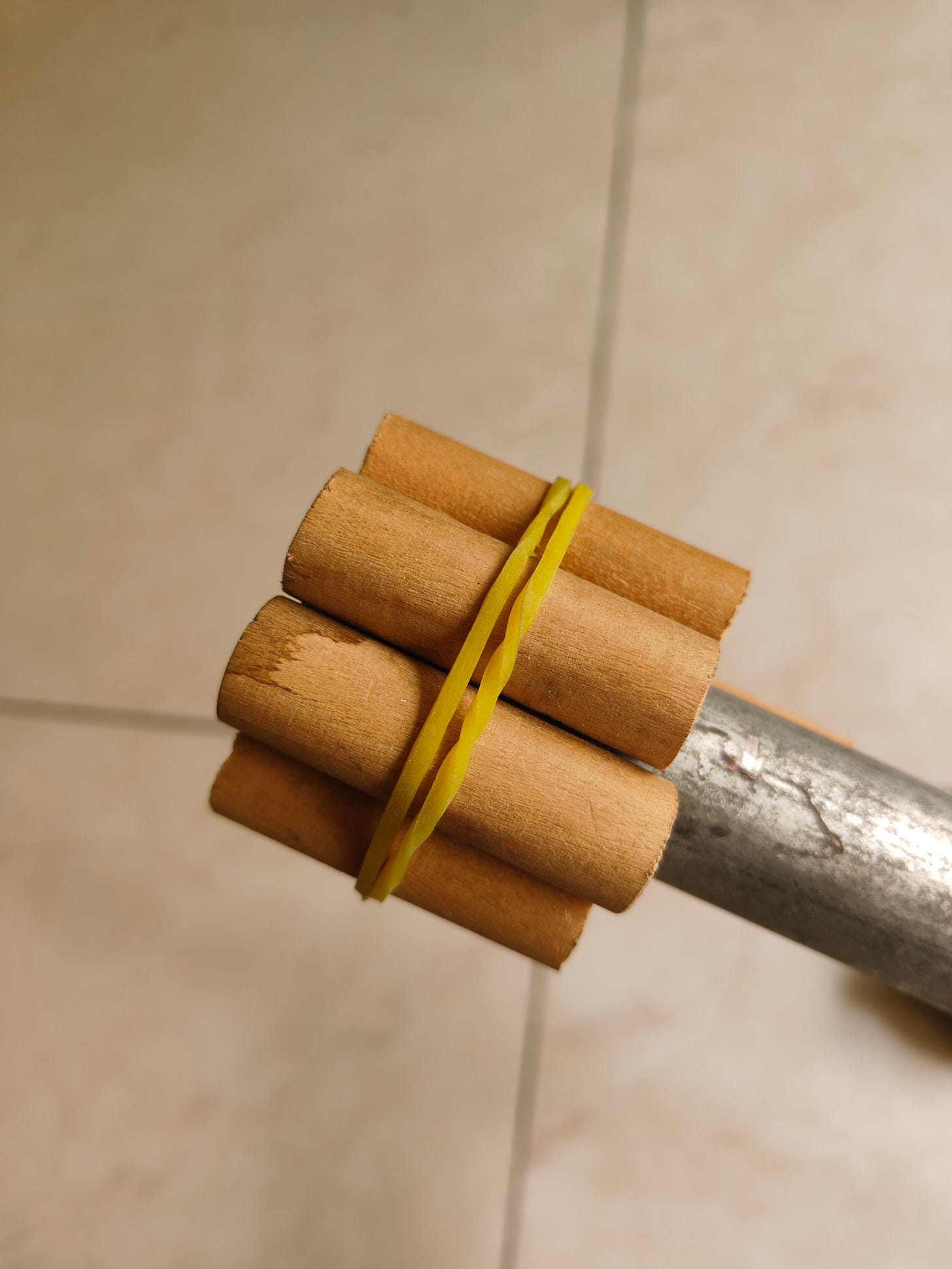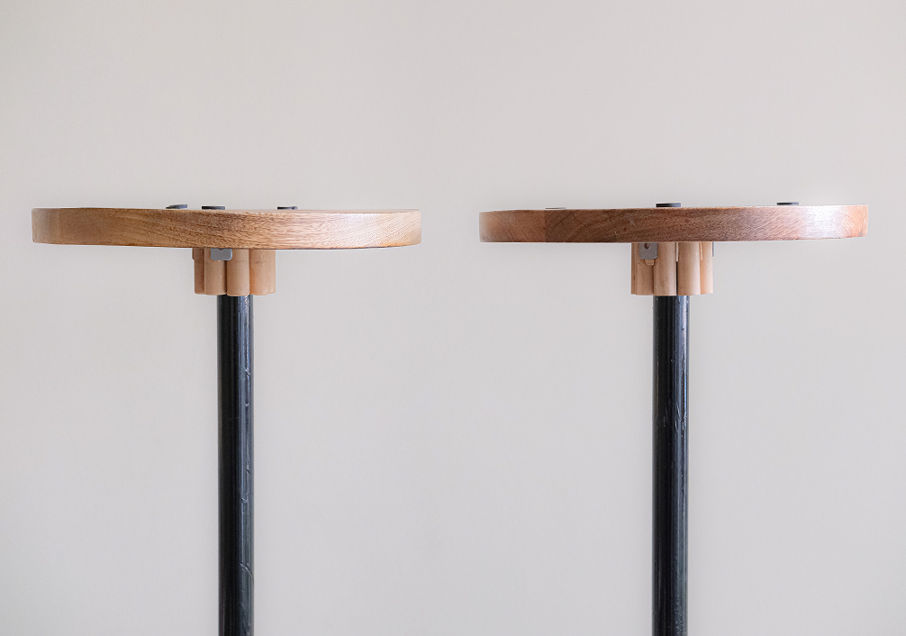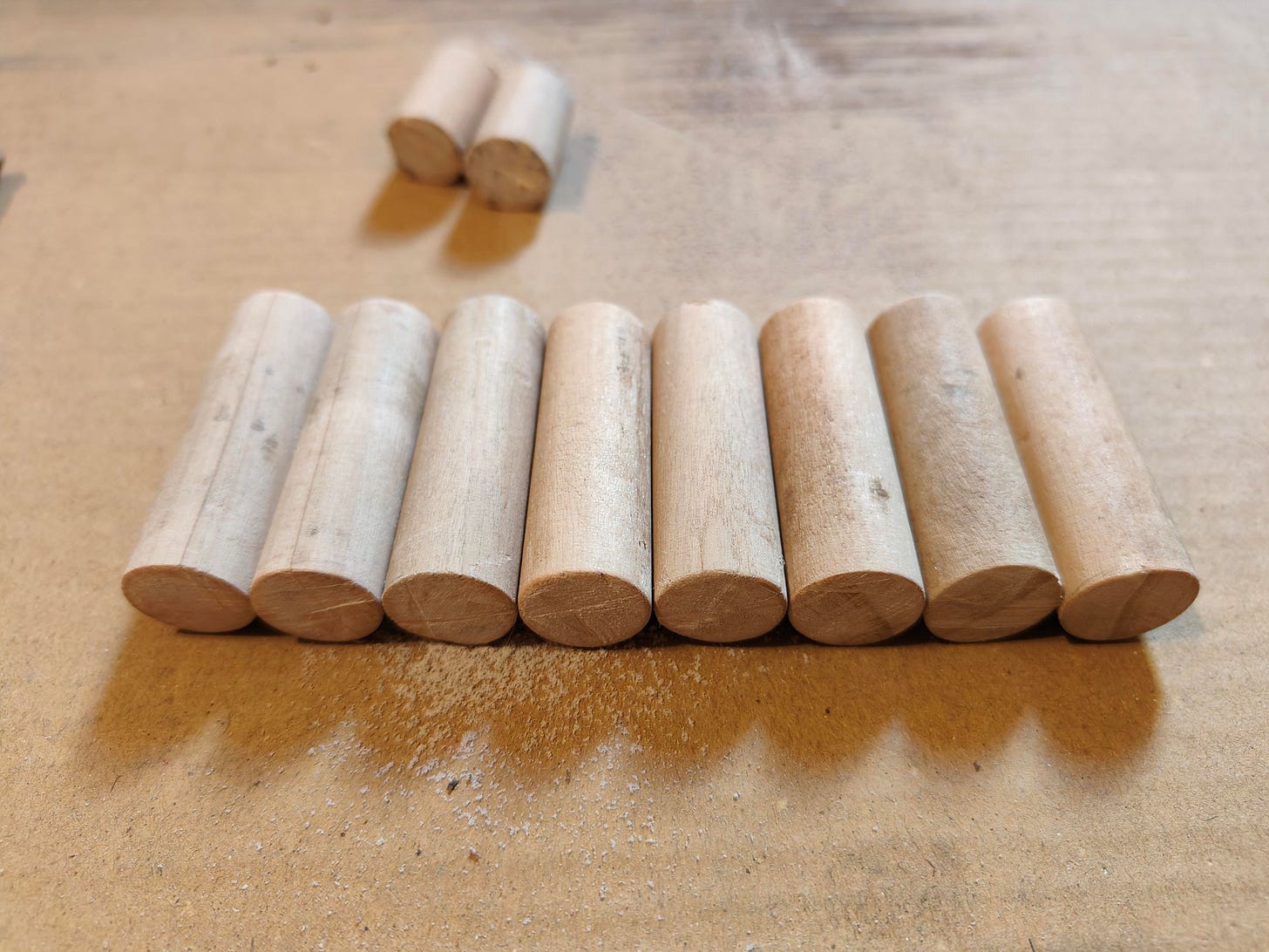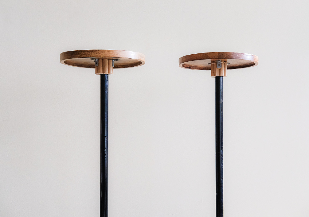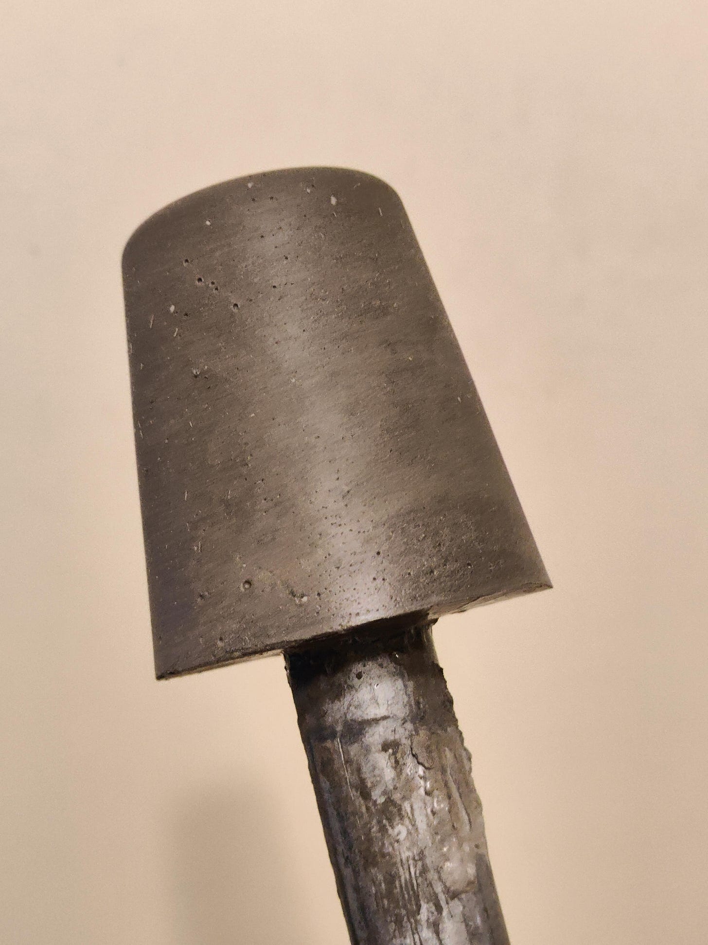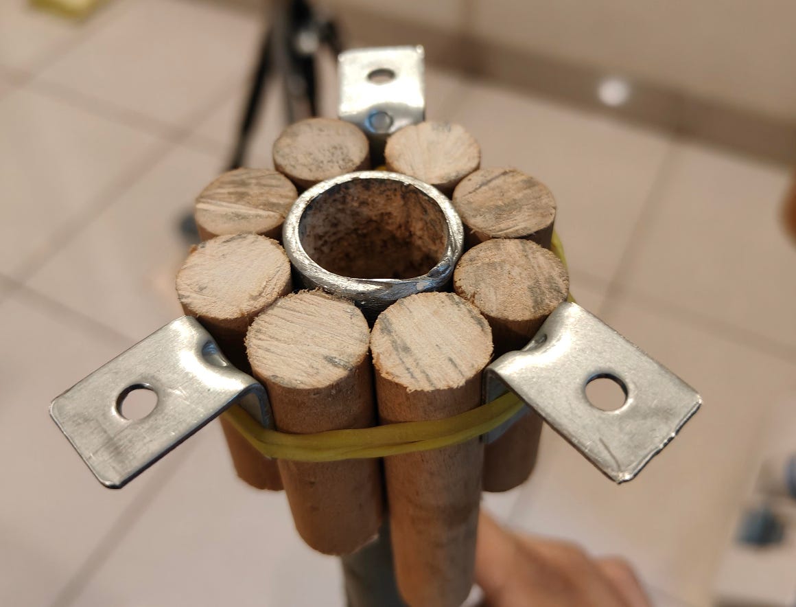 With the cement plug curing tucked away, I shifted focus to the top: the wooden tray. I didn’t want to it bolt straight to the pipe; the metal-to-wood transition would look jarring, and stability might suffer. I needed a broader transition piece— something not so obvious, functional and detailed. Scouring the house like an FBI agent, I found a salvaged wooden stand from a failed guitar stand project that has wooden dowel rods. I absolutely loved how this idea shaped eventually