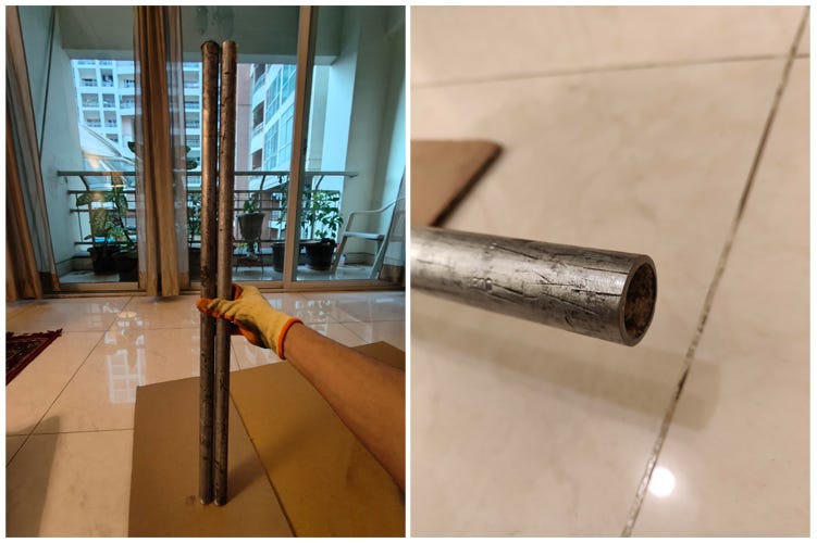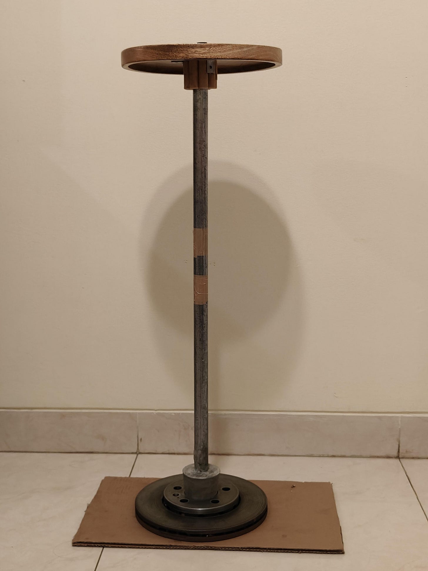 I’d nearly hit '“order” on that Ikea leg(x2) when another stroke of luck— A hot water pipe at home sprung a leak, and after replacing it, I ended up with a 6-foot-long galvanised iron pipe (GI pipe)—25 years old, a bit rusted, dented here and there. It was 25% slimmer than the Ikea table leg but stronger. I had all my pieces: the brake discs to anchor the base, the GI pipe as the spine, and the wooden tray to cradle the speaker. I couldn’t wait—I dove straight into the prototype.