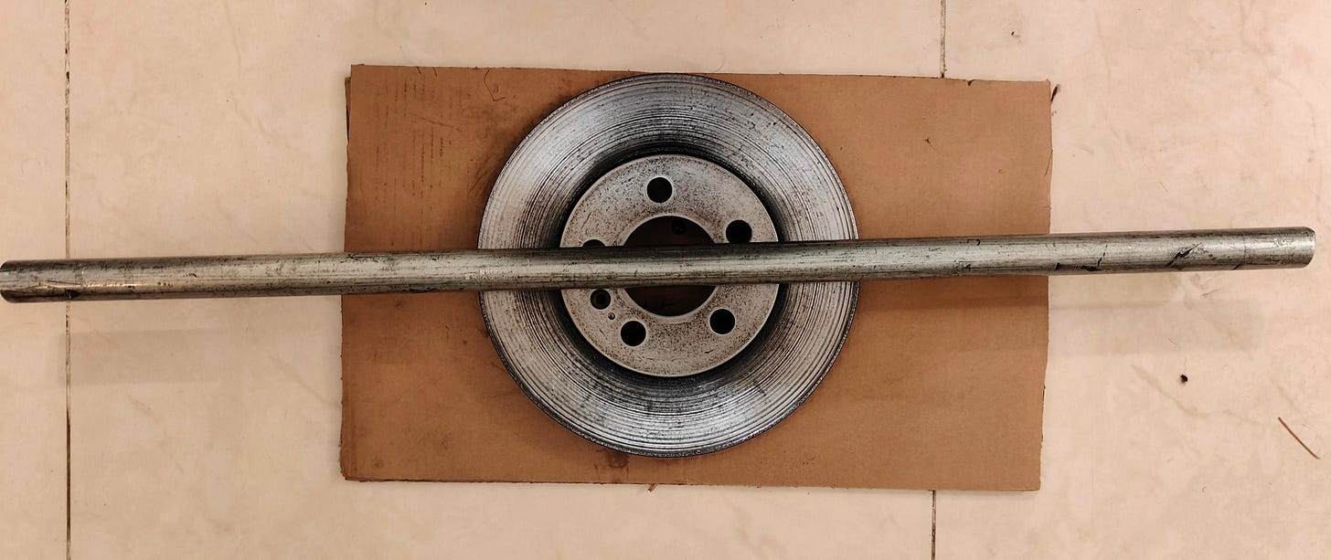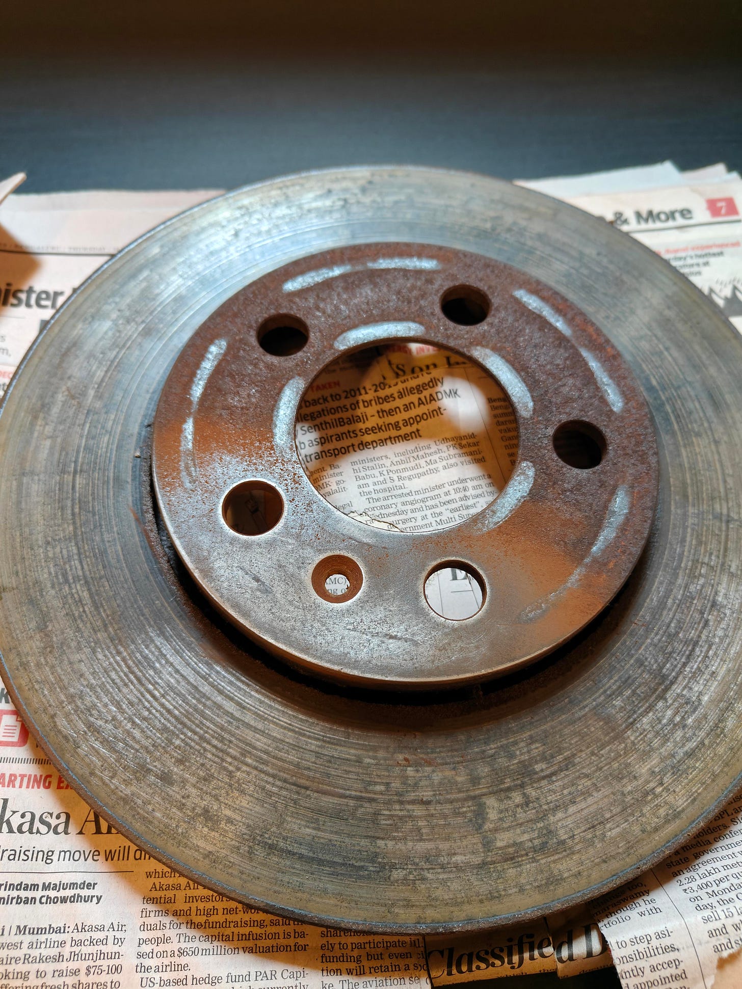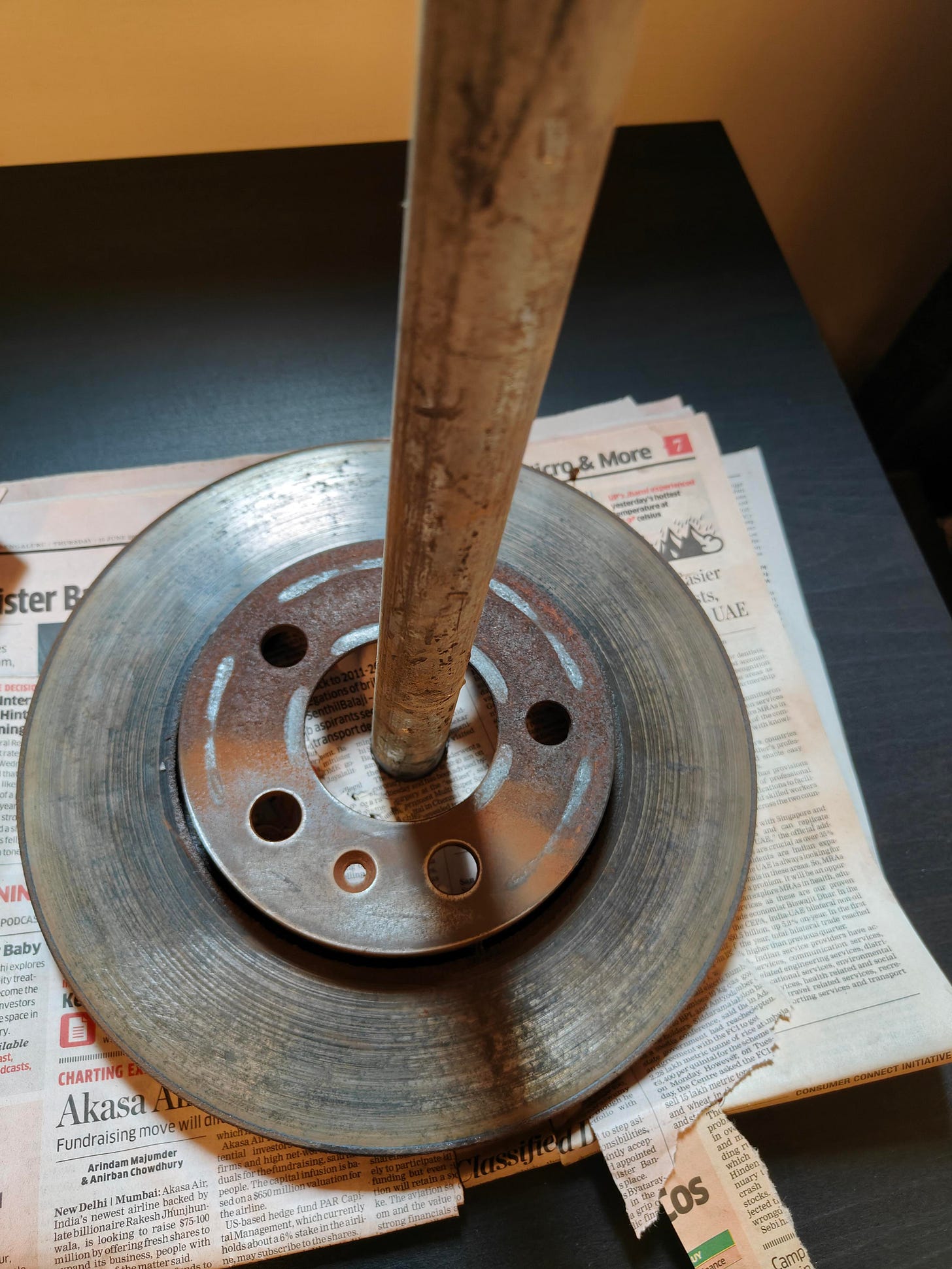 While I was idly mulling over the material for the base, my car went for a service and came back with a set of spare brake discs. These things were heavy, circular, rusted metal discs—each with a decent-sized hole smack in the center. It didn’t take even a fraction of second to realise that this is the base component and I got two of them for “free”.