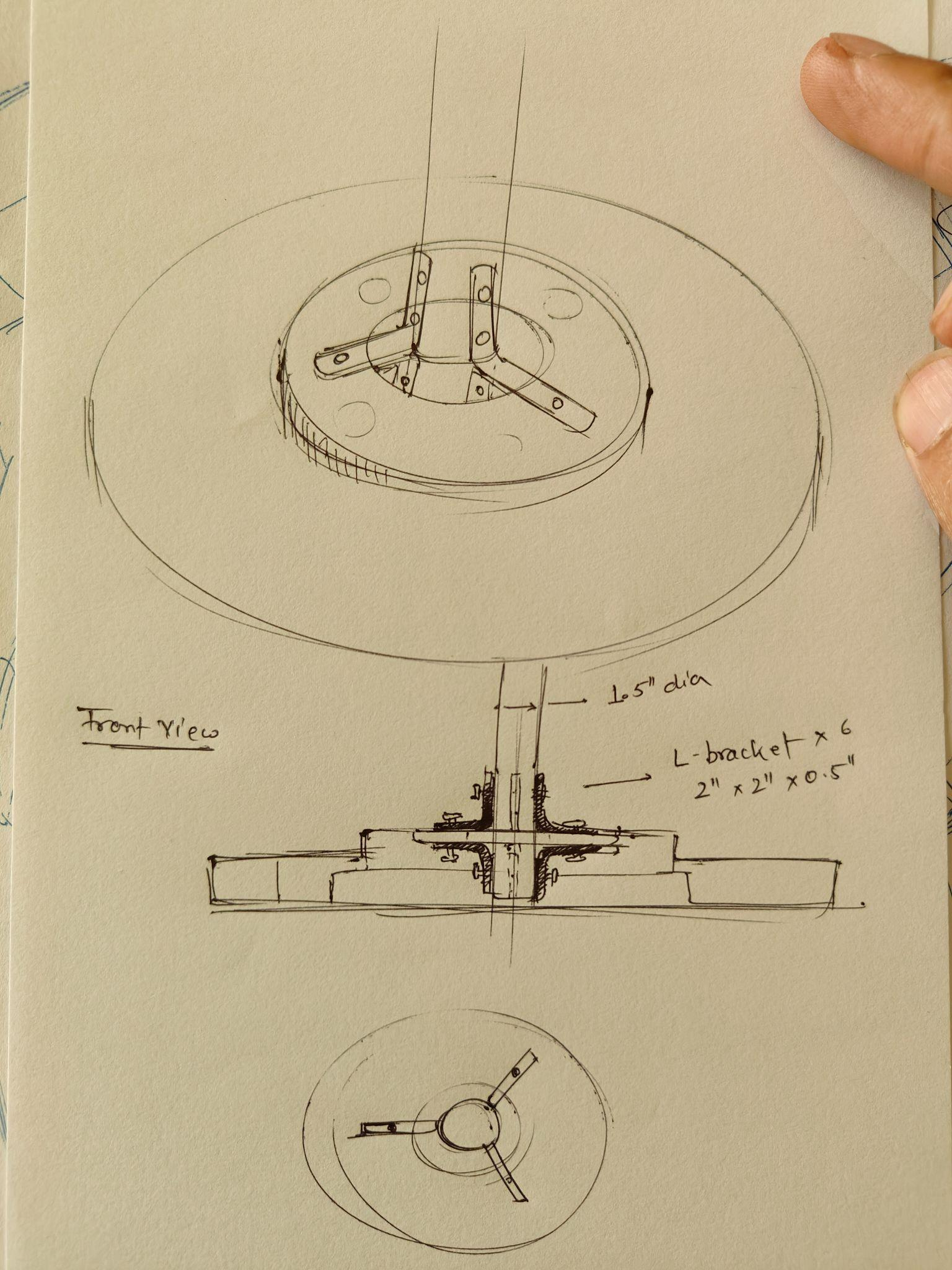 Again, I went back to sketches. My initial idea was to use something like L bracket— maybe three, clamping the pipe to the disc. But it didn’t feel right as there were many flaws with that idea. Precision, durability and finesse couldn’t be guaranteed.