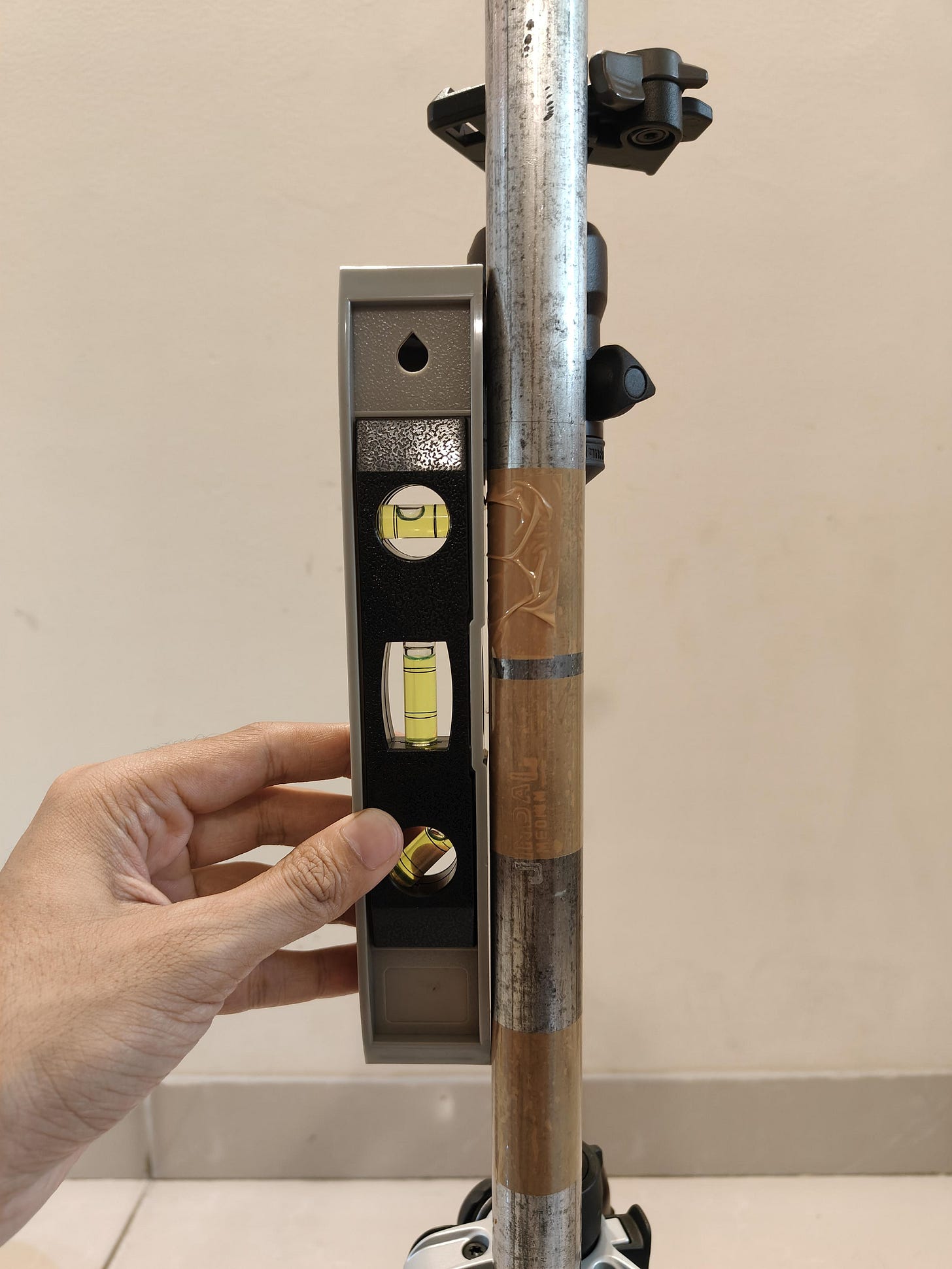 Sometimes I laugh at how my brain works, because my idea of keep the pipe straight was to wedge it between two sofa chairs and pray it won’t budge even a milimeter. What a crappy idea it was until my friend Ashwin swooped in with, “Tripod is your answer”. Of course! the freaking tripod was the answer! What else stays steady and straight, a tripod! I taped the pipe to my camera tripod.